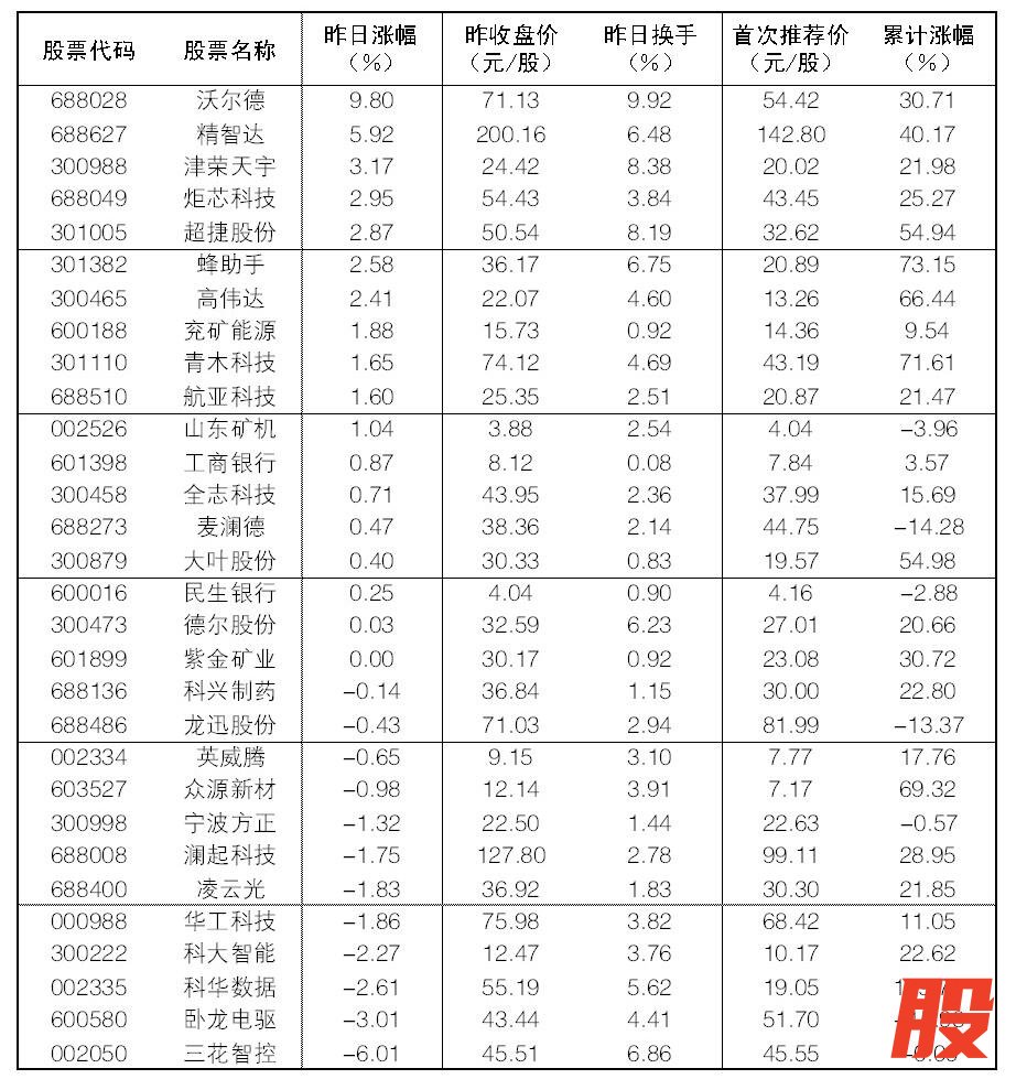 大众30指数成份股中,10日涨幅前五位的分别是沃尔德、精智达、津荣天宇、炬芯科技、超捷股份,涨幅分别为9.80%、5.92%、3.17%、2.95%、2.87%;跌幅榜上,三花智控、卧龙电驱、科华数据、科大智能等跌幅居前。