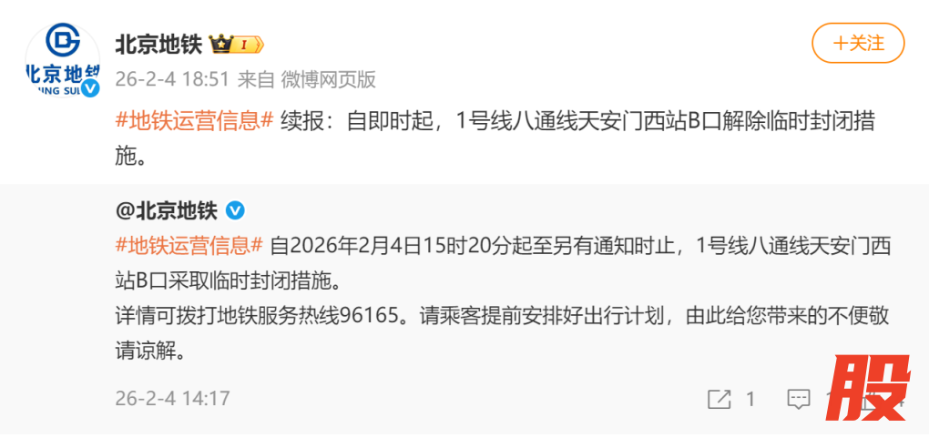 续报:自即时起,1号线八通线天安门西站B口解除临时封闭措施。